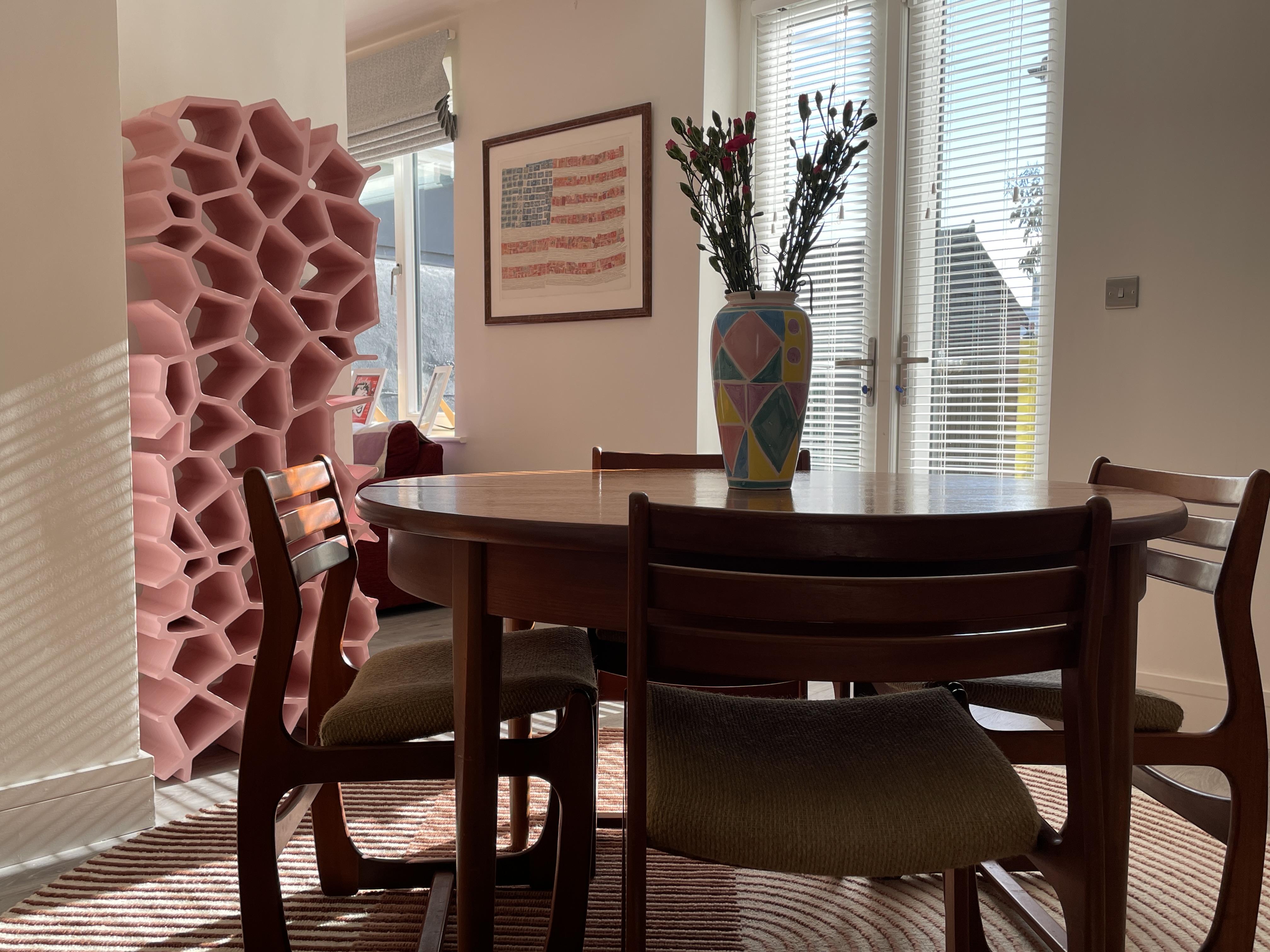 We also supplied our client with a unique VR 120-14 sculpture. Designed by Alfonso Bonilla, this piece is an extruded voronoi geometry, developed with 3D modelling and digital fabrication processes. The finished piece is made of 10 sheets of laser-cut marine ply laminated by hand, finished in dusty pink.